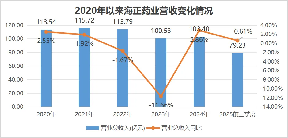 2025年前三季度,海正药业营收为79.23亿元,同比微增0.61%,虽然终结了自2022年以来的连续下滑态势,但归母净利润仅为4.61亿元,同比下滑10.55%。