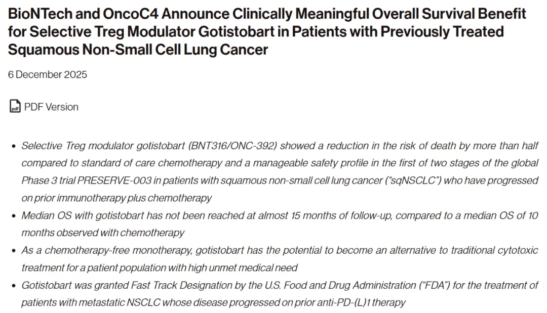 据新闻稿显示,gotistobart在全球Ⅲ期临床试验PRESERVE-003(NCT05671510)中,针对已接受免疫治疗加化疗的sqNSCLC患者,其死亡风险降低了一半以上,安全性可控;在随访近15个月时未达到中位OS,而化疗中位OS为10个月。