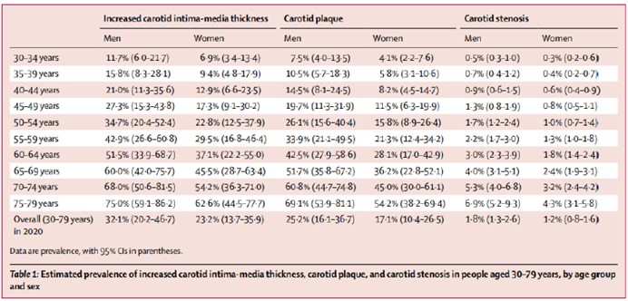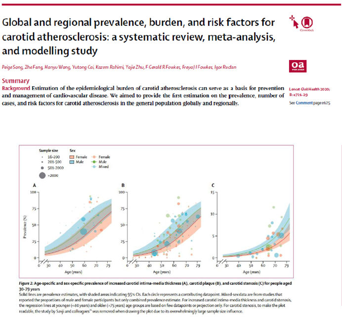动脉粥样硬化(AS)是指动脉血管壁形成粥样硬化斑块而引起管腔狭窄,如斑块破裂形成血栓将会造成相应器官发生缺血性坏死,通常会导致不可逆的器官损。临床表现包括冠状动脉粥样硬化性疾病(即冠心病,严重时可导致心肌梗死),脑动脉粥样硬化性疾病(可引发脑卒中)及外周动脉粥样硬化性疾病(下肢受累最常见,严重时可致肢体缺血坏死)。根据流调数据,2020年全球30-79岁人群的患病率为21.1%,约8.15亿患者。
