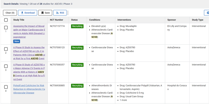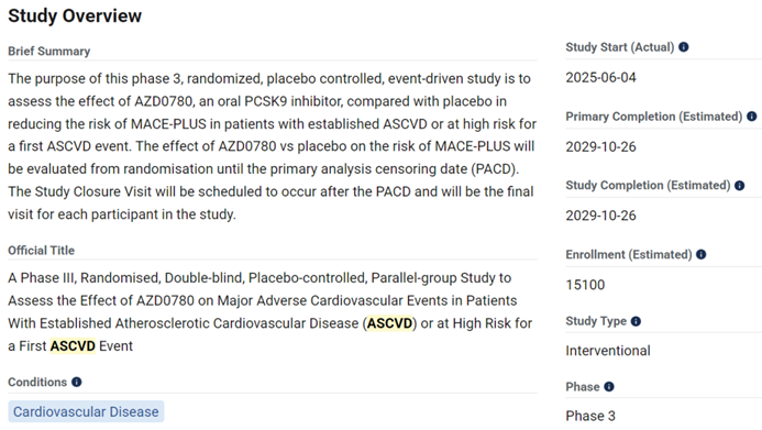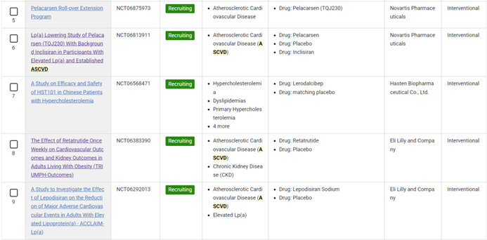 根据Clinicaltrials.gov的注册信息,计有28项ASCVD三期临床试验,几乎均为降脂药,以及减重GLP-1类新药。