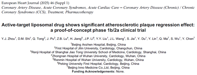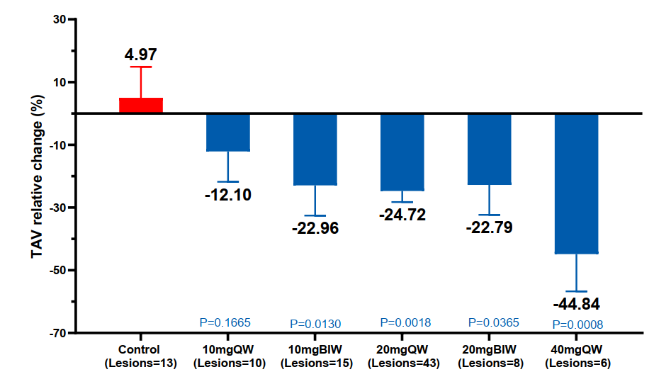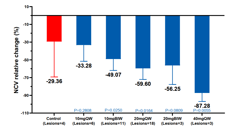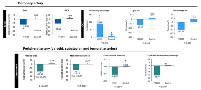 今年9月,安贞医院周玉杰团队在欧洲心脏病学会年会(ESC)汇报了YN001的1b/2a期临床数据。62例受试者接受每周一次或每周二次,累计12周的治疗,通过血管内超声(IVUS)检测单个斑块、CT血管造影(CTA)检测所有斑块,均实现显著的斑块逆转。