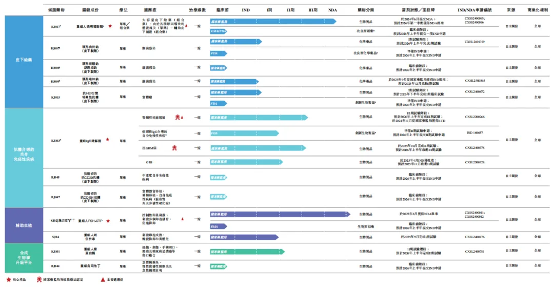 其管线主要包括12款自主开发在研产品,包括三款核心产品(KJ017、KJ103及SJ02(晟诺娃®))、四款其他临床阶段候选药物(BJ007、KJ015、SJ04及KJ101)及五款临床前资产(BJ008、BJ009、BJ045、BJ047及BJ044)。