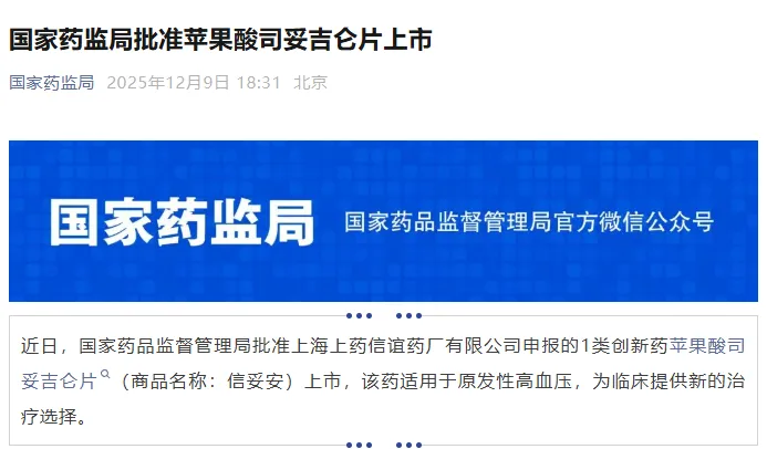 2025年12月9日,国家药品监督管理局(NMPA)官网发布最新公告:批准上海上药信谊药厂有限公司申报的1类创新药苹果酸司妥吉仑片(商品名:信妥安)上市,用于治疗原发性高血压。大爆发!一天6款新药获批上市,另有一款重磅首仿突围
