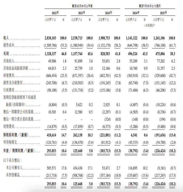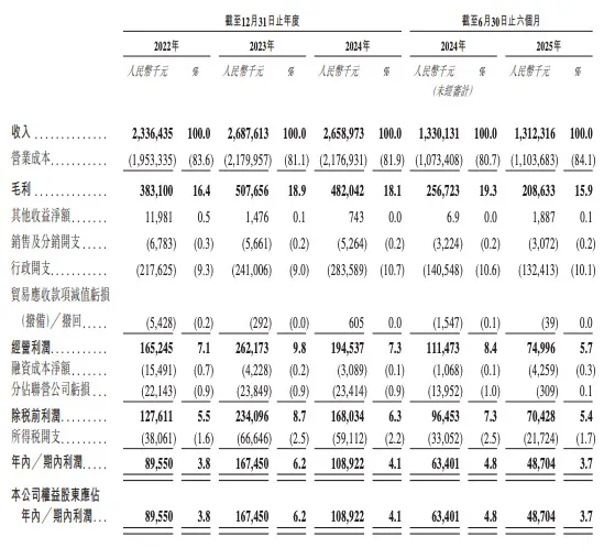 其年内利润由2022年的人民币89.6百万元增至2023年的人民币167.5百万元,并减至2024年的人民币108.9百万元;期内利润由截至2024年6月30日止六个月的人民币63.4百万元减至截至2025年6月30日止六个月的人民币48.7百万元。