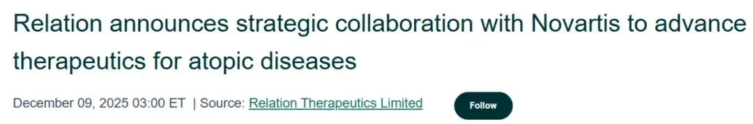 12月9日,Relation Therapeutics宣布与诺华达成多项目战略合作,共同开展特应性疾病新靶点发现与验证。