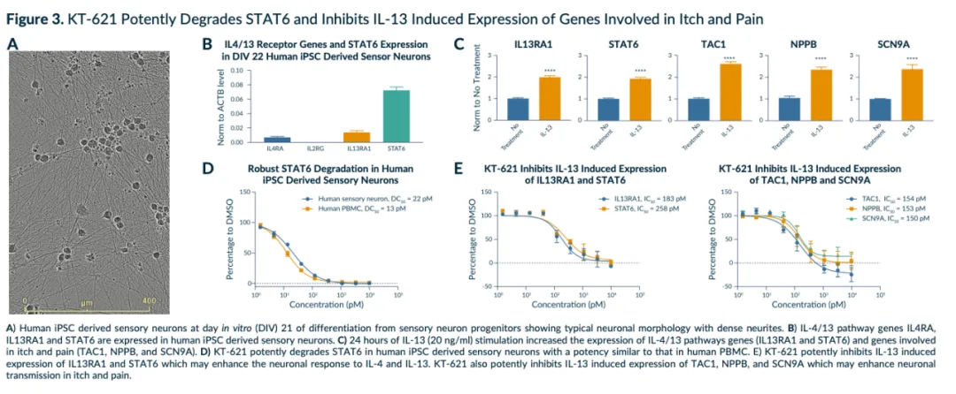 不过从目前KT-621的数据来看,它虽然在IL-4以及IL-13的下游,但是似乎它能反过头去影响上游IL-4/IL-13的功能。如图E所示,KT-621居然可以使得IL-13受体的表达水平下降。至于对其它下游因子的抑制自不必多说。