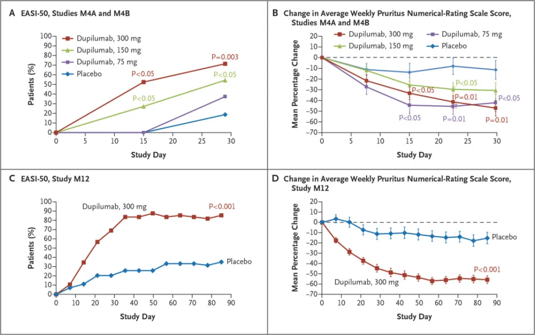 那么现在问题就在于这个数据和度普利尤单抗去对比究竟如何了,这里我们同样拿度普利尤单抗治疗4周的数据来看比较合适,在美国的M4A和M4B研究中,大概能够去反映度普利尤单抗的疗效。但是,这里度普利尤单抗用EASI-50来作为主要终点,我们可以看到,度普利尤单抗的疗效也还不错,在为期4周的治疗中,每周注射一次300mg的治疗组主要终点EASI-50达到了70%左右。并且从后面M12试验来看,四周根本达不到度普利尤单抗的平台期,为期12周的度普利尤单抗单药治疗研究结果重复并扩展了4周的研究结果:度普利尤单抗组85%的患者EASI评分降低50%,而安慰剂组12周的数字为35%。