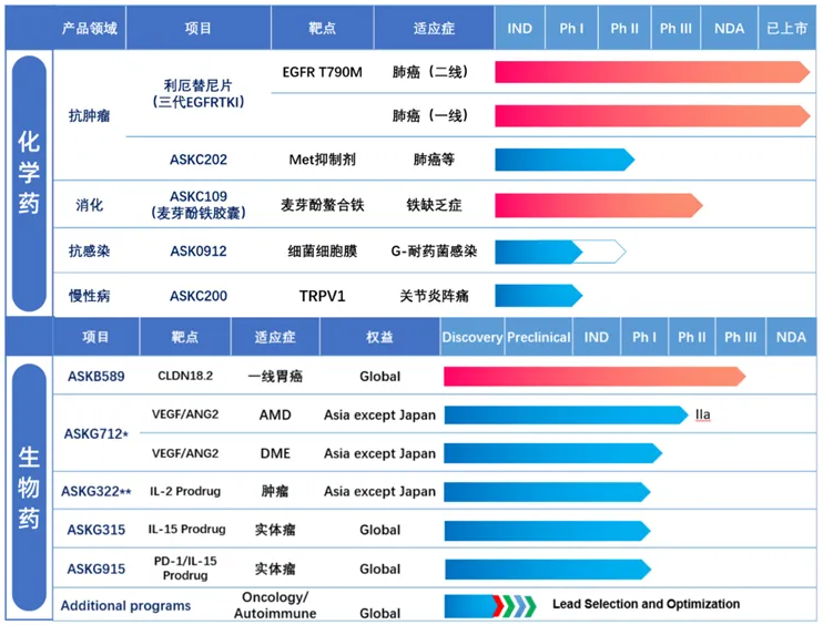 ASKG712是全球研发进度第二的VEGF/ANG-2双抗,用于治疗眼底黄斑疾病,目前处于中国IIa期临床研究阶段。今年10月,奥赛康将其大中华地区、新加坡、泰国等市场的权益以700万美元首付款、最高不超过8900万美元的里程碑付款等授予Visara,而后者又在同一月将其转让给云顶新耀。