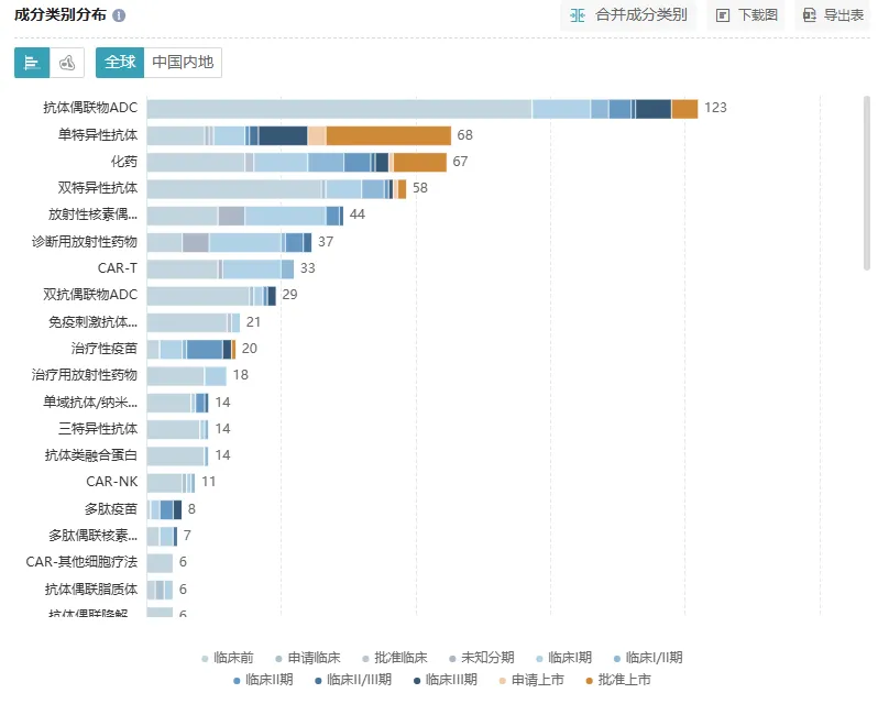 在这所有的研发管线中,ADC 赛道尤为拥挤,数量远超其他技术类型,是第二大药物类型单抗的两倍左右,呈现「千军万马过独木桥」的激烈态势。