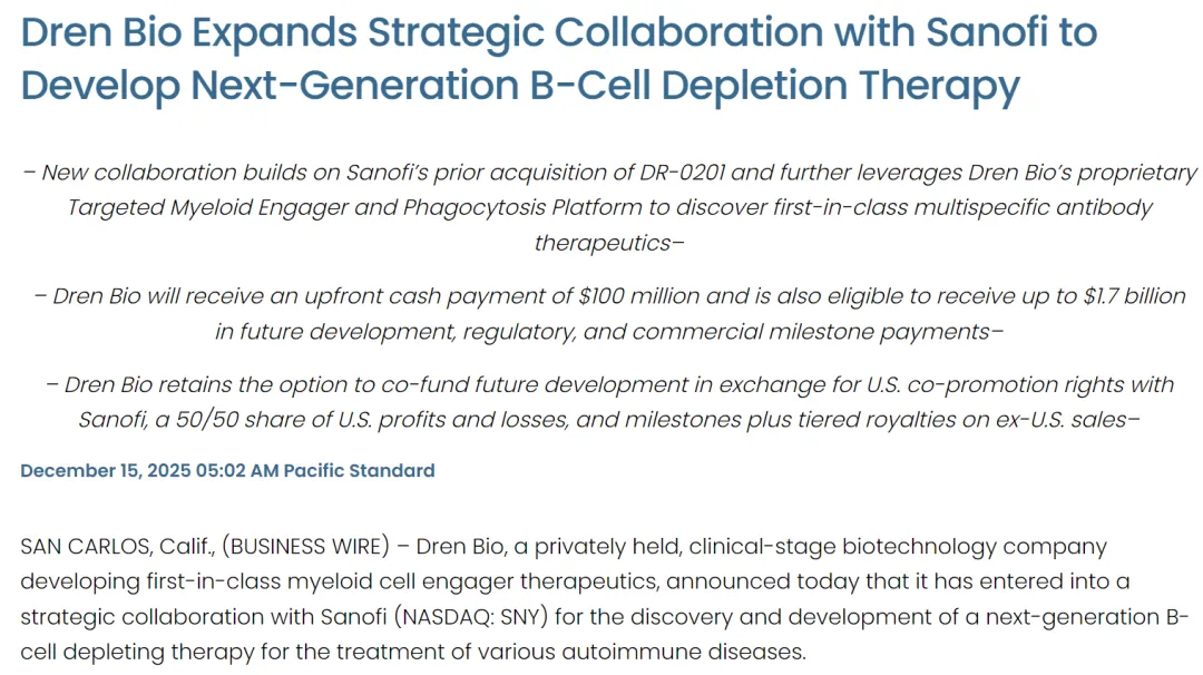 2025年12月15日,赛诺菲宣布与Dren Bio达成扩展合作协议,共同开发首创多特异性MCE疗法。