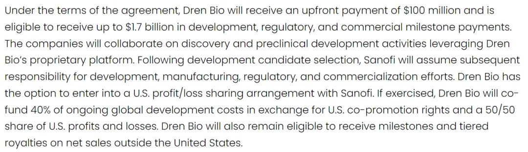 根据协议,赛诺菲支付1亿美元预付款、17亿美元里程碑金额。候选药物选定后,Dren