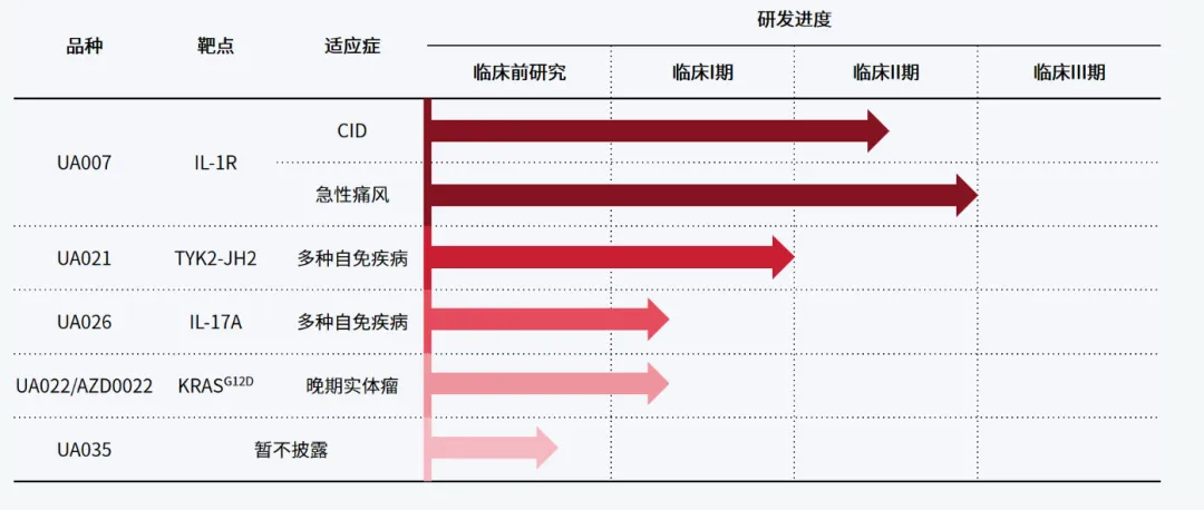 根据当时的协议条款,阿斯利康将获得UA022的研究、开发和商业化的全球独家授权许可。祐森健恒将有资格获得 2400万美元的首付款,此外还将获得最高达3.95亿美元的潜在开发和商业化里程碑付款,以及净销售额的分级特许权使用费。本候选分子由药明康德DDSU联合开发。目前产品线中,没有提示写出合作伙伴字样。