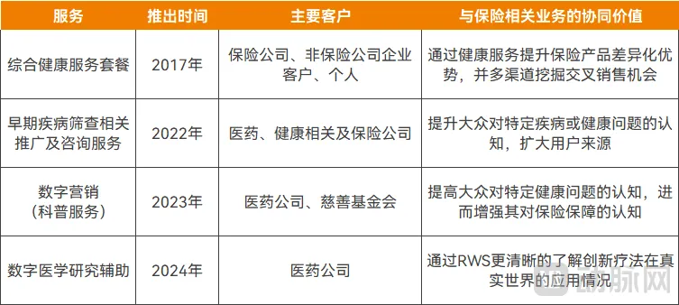 在此背景下,轻松健康将业务范围拓展至健康相关服务,陆续推出综合健康服务套餐、早期疾病筛查相关推广及咨询服务、数字营销(科普服务)、数字医学研究辅助等项目,客户除保险公司之外,还包括医药公司、非保险公司企业客户、慈善基金会等行业参与方。