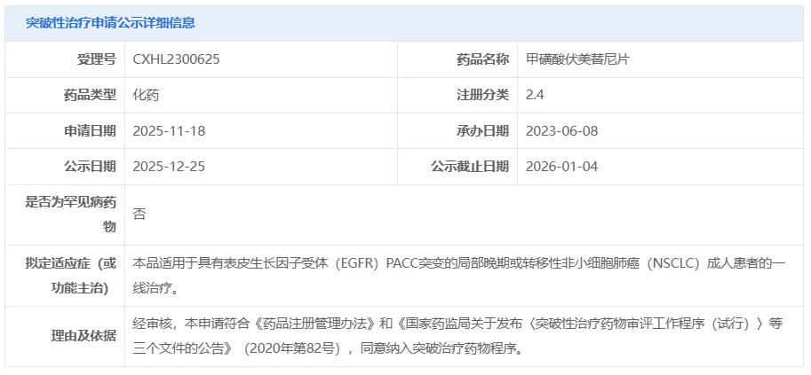 12 月 25 日,CDE 官网显示,艾力斯医药伏美替尼的一项新适应症拟纳入突破性治疗品种,适应症为用于具有 EGFR PACC 突变的局部晚期或转移性非小细胞肺癌(NSCLC)成人患者的一线治疗。