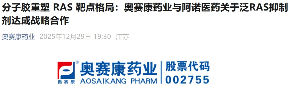 12月29日,奥赛康药业宣布与阿诺医药达成战略合作,以最高超16亿元人民币(3500万元首付款+最高15.98亿元里程碑付款)的总对价,获得后者临床前泛RAS抑制剂AN9025在中国区域的独家权益。