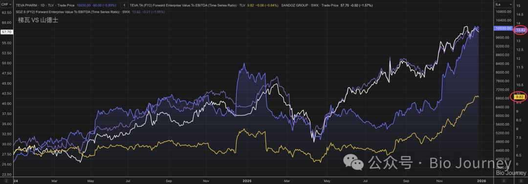 更重要的是,从估值角度看,Teva目前非常便宜。2026年Teva一致预期的估值倍数(EV/EBITDA)大约在不到10倍,而同行业的平均水平在10倍出头(估值横行对比数据略),类似的从事仿制药及生物仿制药业务的山德士同期估值也在13-14倍之间,更别提那些纯创新药公司了。