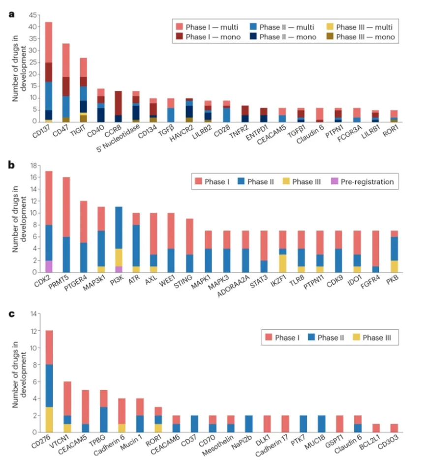 针对全新靶点的在研药物数量分布不均,通常在首款药物获批前,已有多个企业布局同一靶点。以CD137(又称4-1BB)为例,该靶点表达于活化的免疫细胞表面,目前已有42款靶向CD137的抗体类药物处于Ⅰ-Ⅲ期临床阶段,包括12款单克隆抗体和30款多特异性抗体(含双抗、三抗及四抗)。双特异性抗体药物常采用“成熟靶点+全新靶点”的组合策略,以实现双通路协同增效。