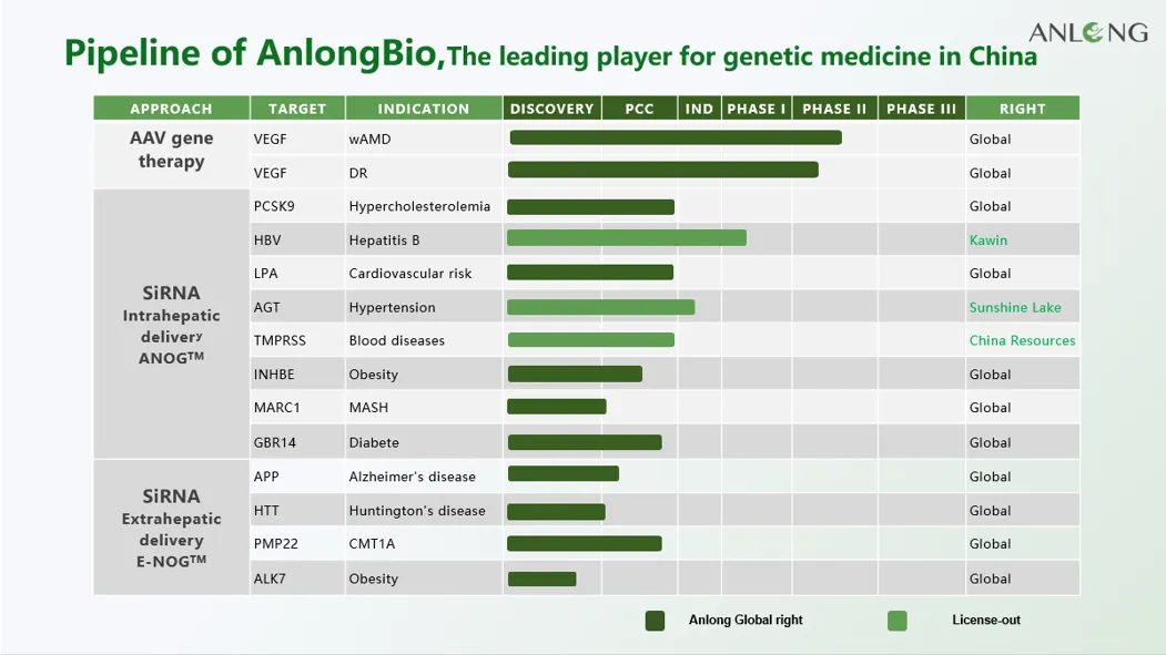 多年来,安龙生物在基因治疗AAV与小核酸药物siRNA两大技术平台上实现战略拓展。在产品研发进展方面,安龙生物多条产品线持续推进。目前进展最快的是针对眼科湿性年龄相关性黄斑变性(wAMD)的脉络膜上腔给药基因疗法AL-001,已完成II期临床入组,并获准开展糖尿病视网膜病变适应症的II期临床试验。