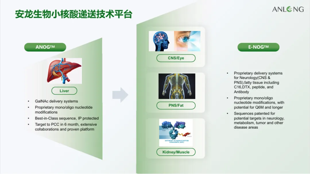 安龙生物的小核酸药物技术平台为ANOG PlatForm,能够快速的建立特有的药物筛选体系,针对已知或者新靶点,能高效开发出Best-in-class(或me better)药物。目前已经建立了AGT、PCSK9、 LPa、 C3、TTR、XDH、HSD17b13等多个动物筛选模型,能够快速有效地在动物体内筛选siRNA候选产品。