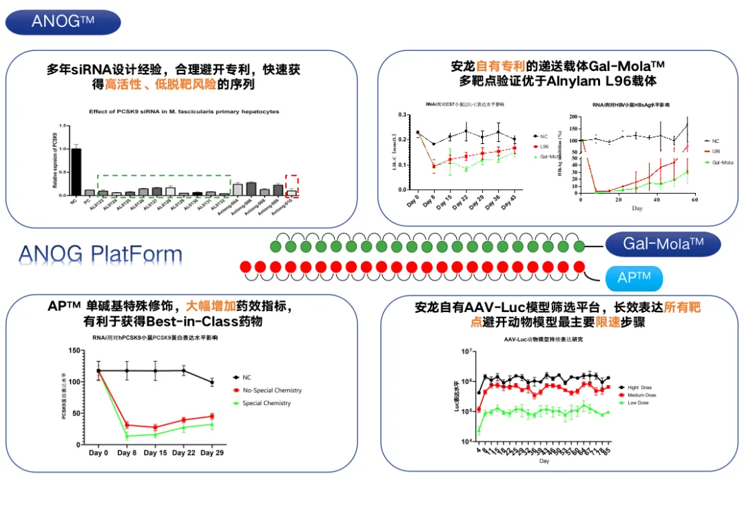 安龙生物还具有Gal-Mola半乳糖小核酸药物递送载体。相较于市场现有成熟递送载体(诺华/Alnylam L96 GalNAc载体),Gal-Mola载体可以明显延长靶向基因表达的抑制持续时间,且在多个靶点及序列中得到验证。更长时间的靶点表达抑制,可以降低单次给药剂量或者减少给药频率,达到半年给药甚至年度给药。同时,安龙生物的寡核苷酸修饰技术,能够极大的提高SiRNA药物在细胞内的装载效率,从而增加肝暴露量,获得更强的药效和更长的药效持续时间。