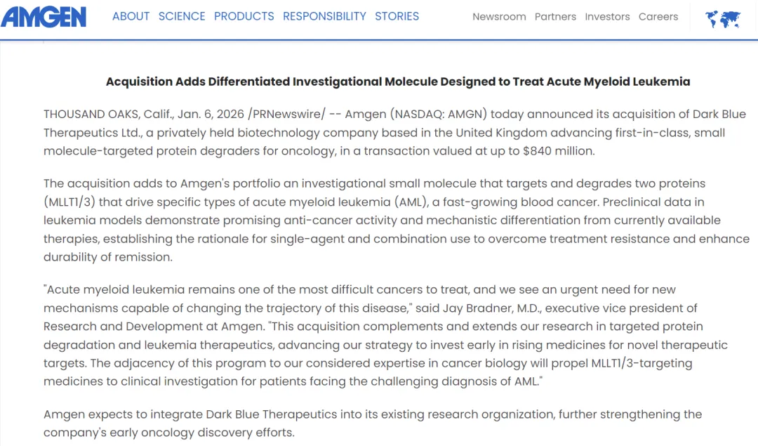 2026年1月6日,安进宣布以8.4亿美元的价格收购英国生物技术公司Dark Blue Therapeutics,获得其核心管线MLLT1/3降解剂等,该管线目前处于临床前阶段。
