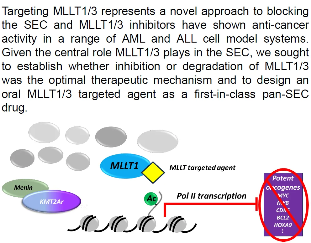 complex(SEC)发挥核心作用,相关小分子抑制剂在AML和ALL细胞模型上表现出疗效潜力,Dark Blue致力于找到最合适的药物形式和最佳分子。