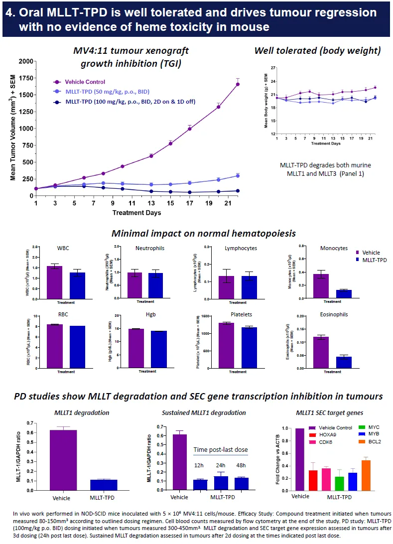 临床前体内研究中,MLLT1/3抑制剂表现出良好的耐受性和优异的抗肿瘤活性,同时没有明显的血液毒性。