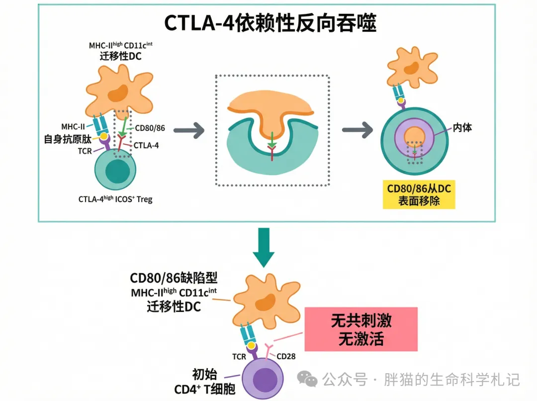 第二点是,Treg细胞表面存在较高的、持续表达的CTLA-4,通过和CD80/86结合从APC细胞表面通过跨内吞移除CD80/86介导,间接抑制T细胞的共刺激信号。
