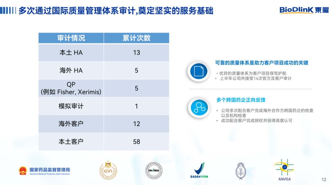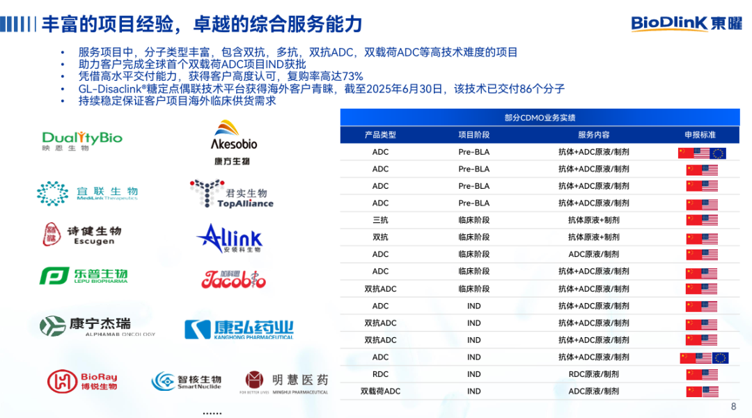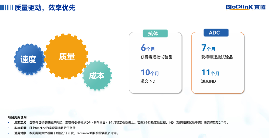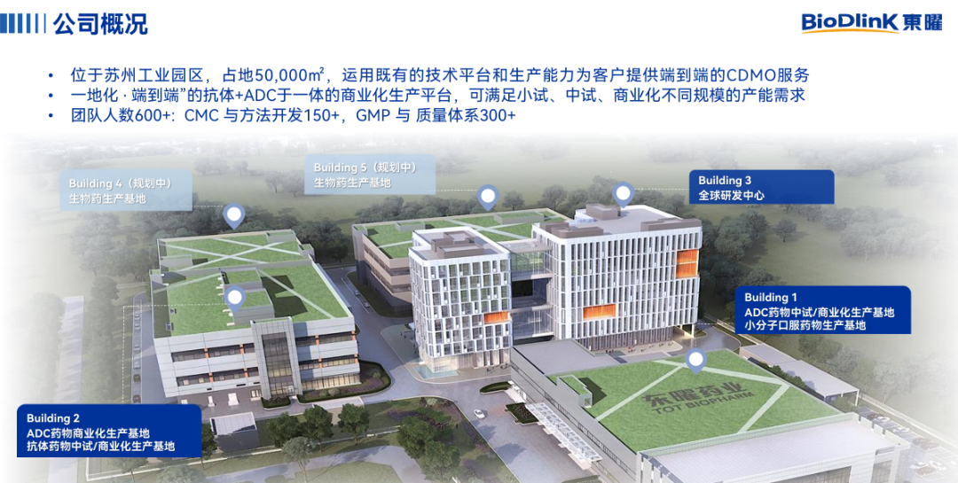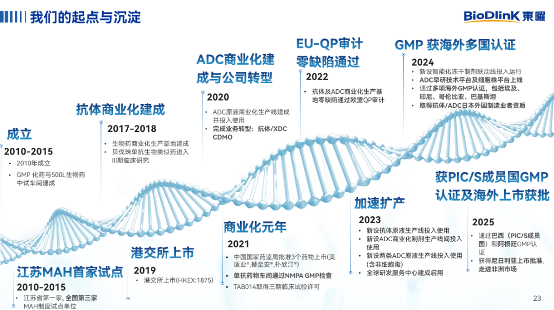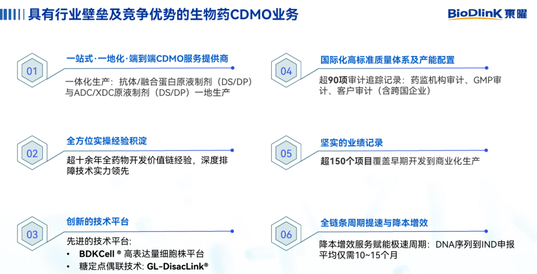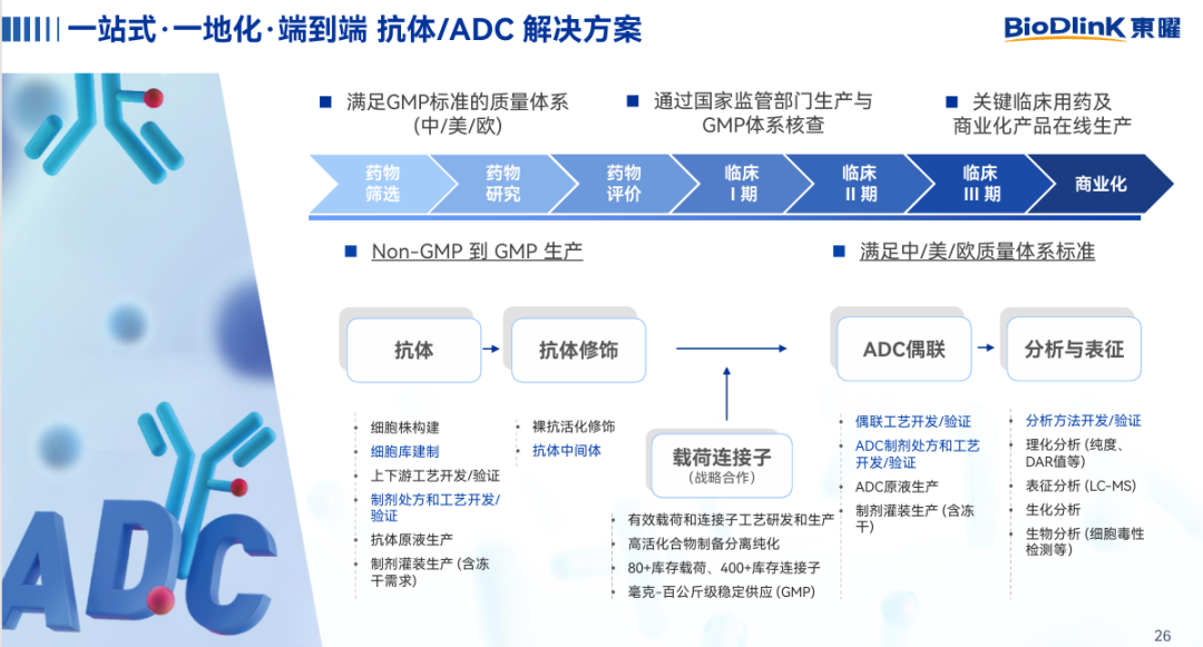 L;公司已搭建ADC一体化平台,具备核心研发技术优势,可实现ADC抗体/抗体中间体、原液、制剂等关键生产环节集中一地完成,降低转移成本并减少监管风险;目前,公司已建立符合商业化生产的质量管理体系,并已支持多个上市产品的商业化生产。东曜药业拥有成熟稳定的核心团队以及良好的服务口碑,向客户提供品质卓越的专业服务。