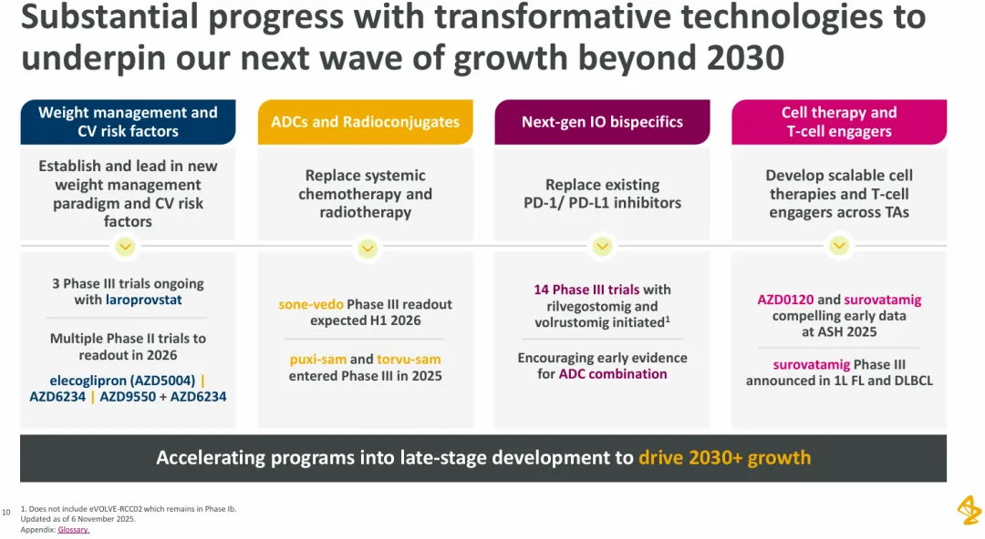 阿斯利康在其展示中重申了“到2030年实现800亿美元总收入”的雄心。公司2025年前九个月表现强劲,总收入增长11%,核心每股收益增长15%。其战略核心在于五大重点治疗领域(肿瘤、心血管、肾脏与代谢、呼吸与免疫、疫苗与免疫疗法)的均衡发展,并通过全球布局与多元化业务来源支撑增长。
