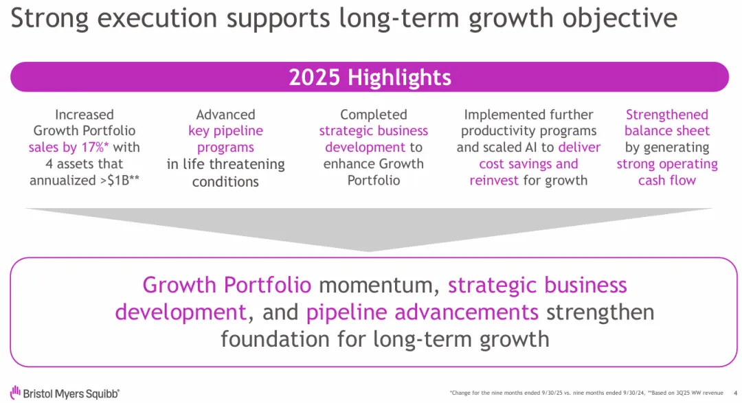 百时美施贵宝(BMS)提出“构建一家财务强劲、在2030年代及以后实现行业领先可持续增长的公司”的目标。公司2025年的增长产品组合销售额增长了17%,并通过战略性业务发展增强了管线。