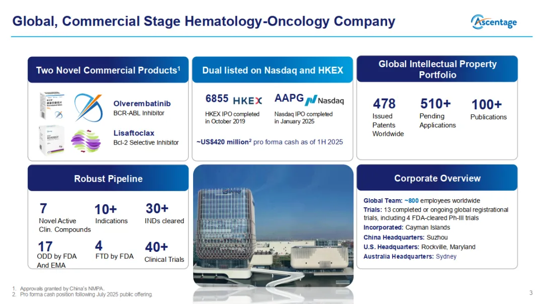 亚盛医药围绕两大核心上市产品耐立克®(第三代BCR-ABL抑制剂奥雷巴替尼)与利生妥®(Bcl-2抑制剂利沙托克拉)构建覆盖血液肿瘤领域的广阔全球化治疗版图。