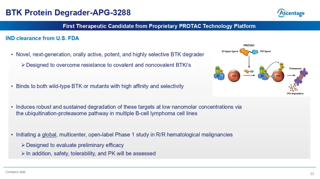 亚盛医药的前沿技术转化与多元化管线建设已取得突破性进展。基于PROTAC技术平台自主研发的首个新型高效、高选择性BTK靶向蛋白降解剂APG-3288已获FDA临床试验许可,标志着公司在靶向蛋白降解领域的研发成果正式进入临床阶段。这一布局也为公司深度挖掘该药物与公司已有小分子靶向药之间的联合治疗潜力奠定了基础。
