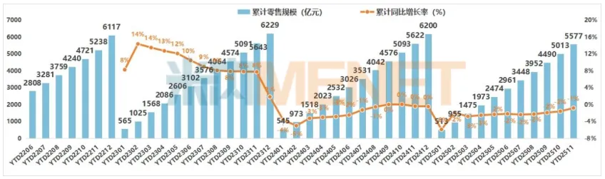 2025年1-11月中国实体药店市场累计零售规模及变化趋势