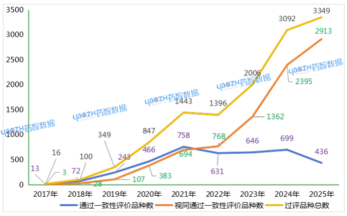 2025年共有3349个品种(以药品名称+集团企业除重统计)通过/视同通过一致性评价,其中首次按一致性评价申请通过的药品47个,按新注册分类仿制药申报上市的药品223个,全年新增独家过评品种129个(截至12月31日)。