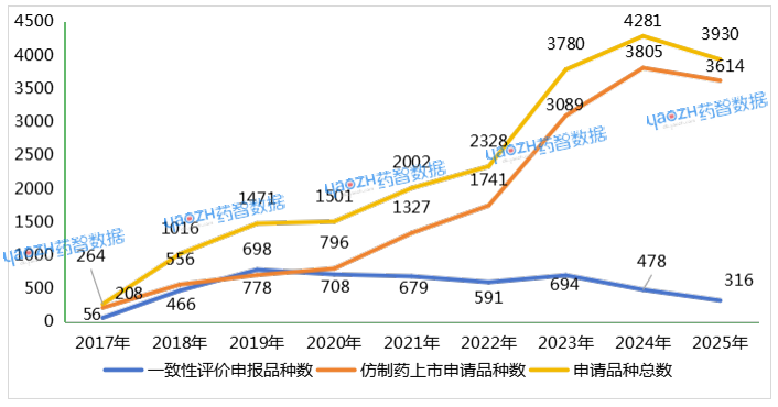 2025年一致性评价补充申请和新注册分类仿制药上市申请方面,共计3930个品种(药品名称+集团企业去重统计)。