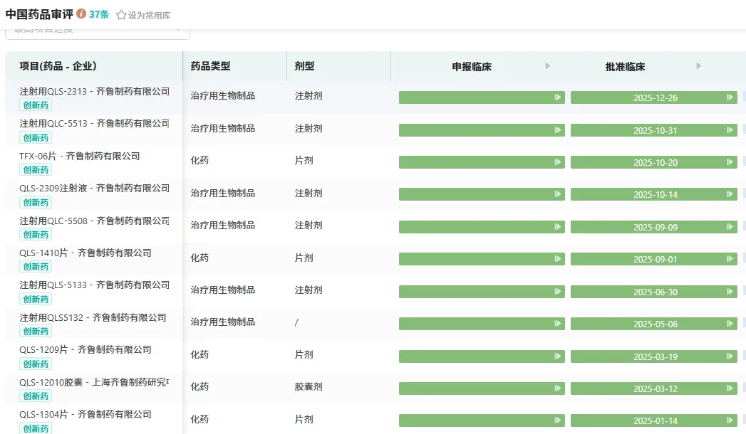 生物药是齐鲁制药重点布局的药品类型之一。摩熵医药数据库的数据显示,2025年,齐鲁制药共有11款1类新药首次在国内获批临床,其中6款为生物药。这些新药的适应症高度集中在抗肿瘤领域,涵盖了ADC、双抗、单抗等多个热门研发方向。