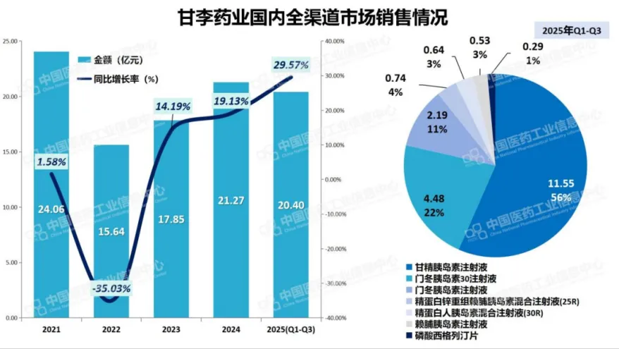 甘李药业创制于1998年,经过近三十年发展,公司已成为中国第一家掌握产业化生产重组胰岛素类似物技术的高科技生物制药企业。根据PDB数据库显示,甘李近年来国内三大终端市场销售业绩呈现逐年递增,2025年Q1-Q3同比增长29.57%,全年有望突破25亿。其中,甘精胰岛素注射液(长秀霖)销售额占比56%,相当于甘李半数以上的市场销售表现。