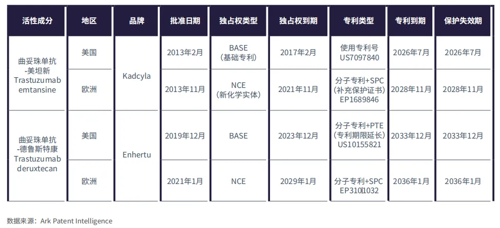 表2:Kadcyla和Enhertu在美国和欧洲专利及独占权到期情况