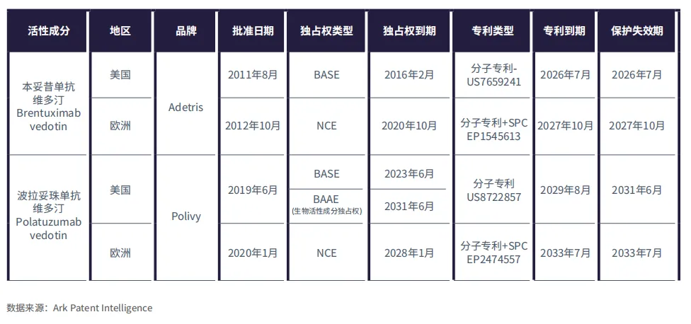 表3:Adcetris和Polivy在美国和欧洲专利及独占权到期情况