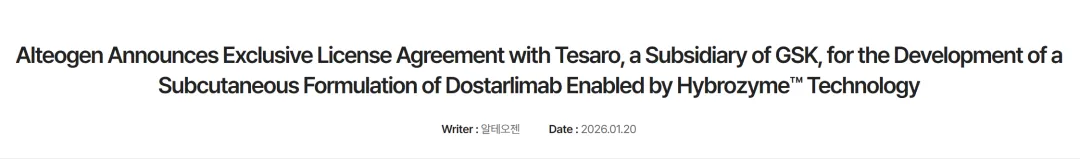 2026年1月20日,韩国药企Alteogen宣布与GSK子公司Tesaro签署独家许可协议。根据协议,Tesaro将获得全球范围内使用ALT-B4的权利,用于开发并商业化抗PD-1单抗dostarlimab的皮下制剂。