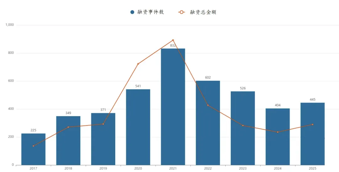 B轮及之后的较后期项目融资金额达569.31亿元,占总金额的三分之二,相比2024年的473.97亿元增长近百亿元。而两年的融资事件数相近,2025年为837件,2024年为826件。