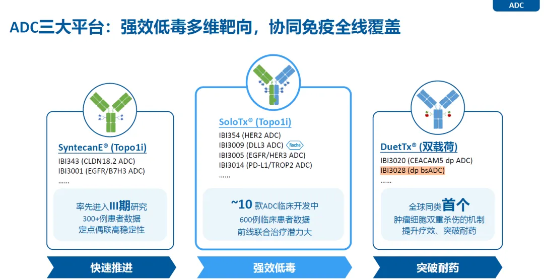 的信达生物围绕ADC进行了系统性布局,建立了三个技术平台,分别为SystecanE技术平台、SoloTx技术平台、DuetTx双毒素技术平台。IBI3028为一款DuetTx技术平台基础上构建的双靶点双毒素ADC。
