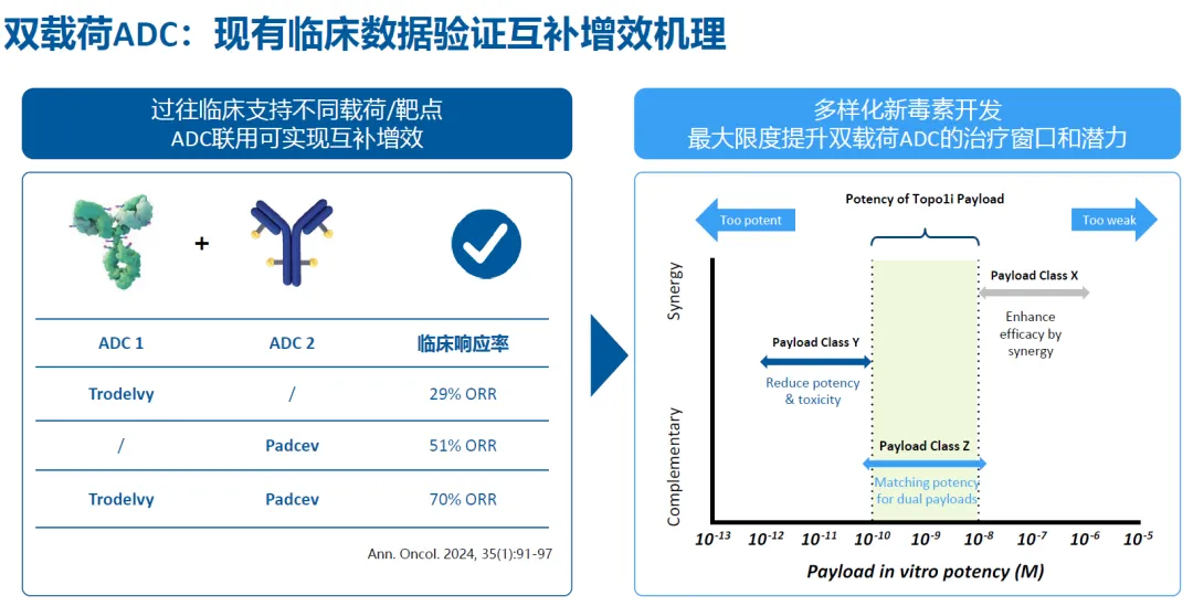 双抗ADC的设计逻辑在于组合两种TAA克服肿瘤一致性,并实现更好、更深的治疗响应。双毒素ADC则通过组合两种毒素增强疗效、克服耐药。
