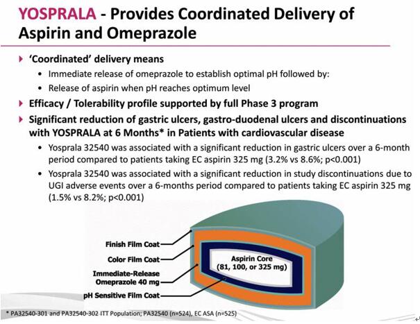 YOSPRALA获得美国FDA的批准是基于两个随机、双盲、对照组的临床试验。与那些单独服用肠溶阿司匹林的患者相比,服用YOSPRALA的患者显着降低了内窥镜胃溃疡风险,达到了临床研究的主要终点。