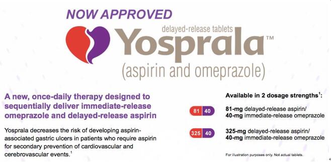 昨天,加拿大制药公司 Aralez Pharmaceuticals 宣布,美国FDA已批准其产品YOSPRALA(每日一次)用于那些服用阿司匹林来预防心血管和脑血管疾病的患者,他们有发展阿司匹林相关性胃溃疡的风险。目前,YOSPRALA是复含抗血小板剂(阿斯匹林)和质子泵抑制剂(proton pump inhibitor ,PPI)omeprazole(奥美拉唑)的唯一处方型双药固定剂量复合剂。