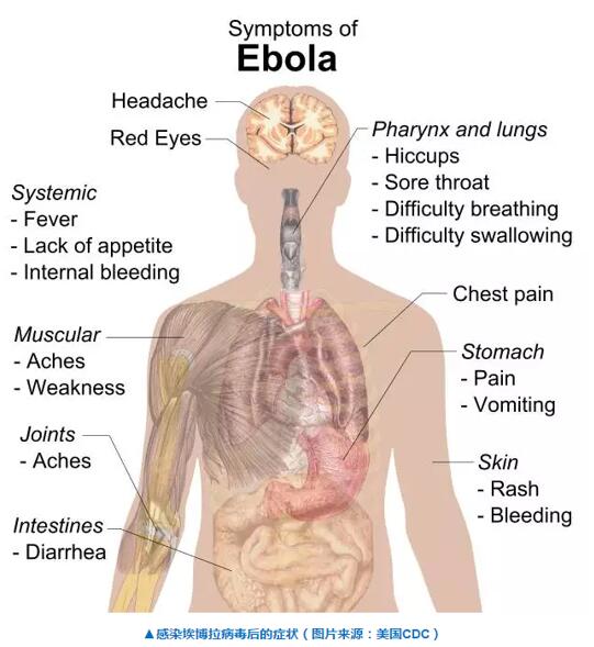 埃博拉病毒是导致埃博拉出血热的致病元凶。埃博拉出血热是一种急性病毒性出血性传染病,患者不仅有发烧、头痛、关节和肌肉疼痛、乏力等不适,更有腹泻、呕吐、胃痛、食欲不振及异常出血等众多严重症状。埃博拉病毒通过直接接触受感染者体液或已被病毒污染的器具传播,并不通过水、食物或是空气传播。