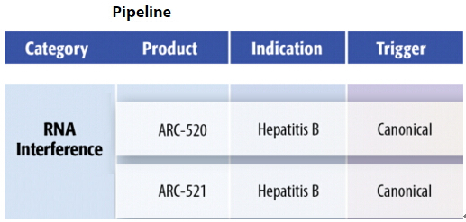 2015年,总部位于美国加州的Arrowhead公司发布了基于RNAi技术治疗乙肝的药物的2款研发管线药物ARC-520和ARC-521的研究进展,其原理是通过RNA干扰作用来封闭乙肝病毒某些蛋白的表达,导致病毒无法增殖,然后再利用人体免疫系统对剩余病毒进行清除,实现免疫清洁状态(immune clearant state),使得乙肝表面抗原(HBsAg)血清学转阴或消失,具有功能性治愈乙肝的潜力。