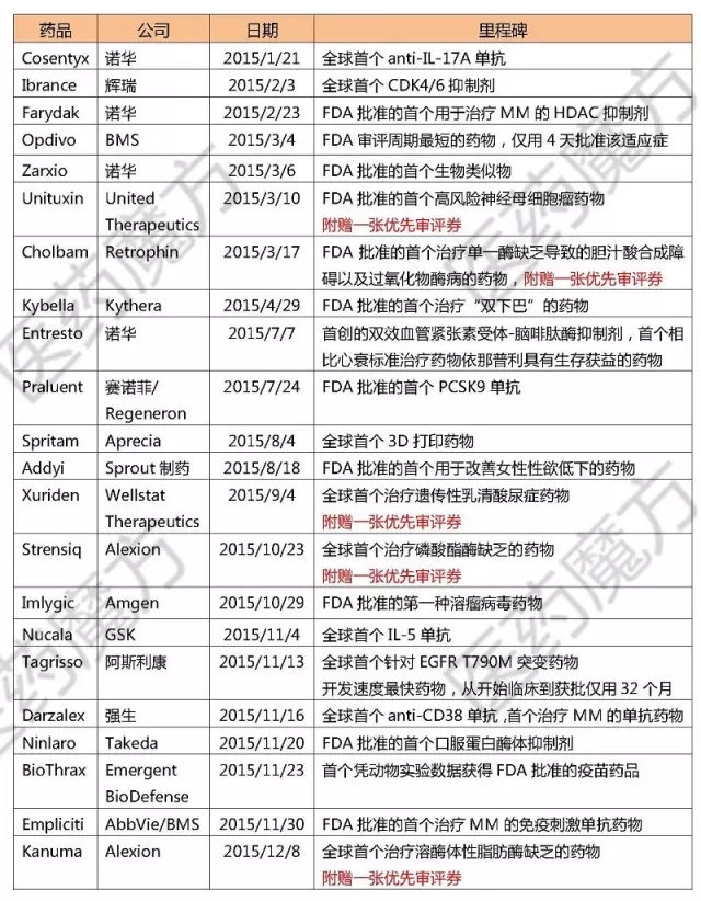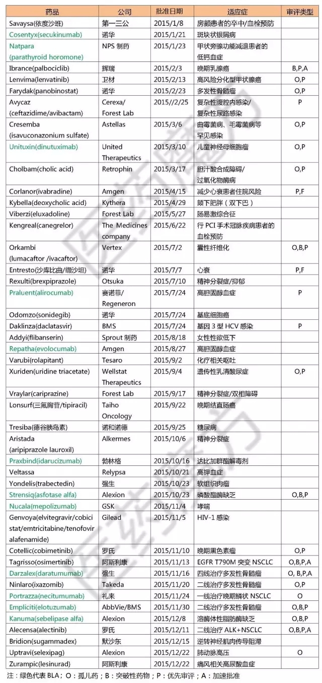 2015年FDA共批准45个新药,包括33个新分子实体(NME)和12个新生物制品,创下自1997年以来的历史新高。