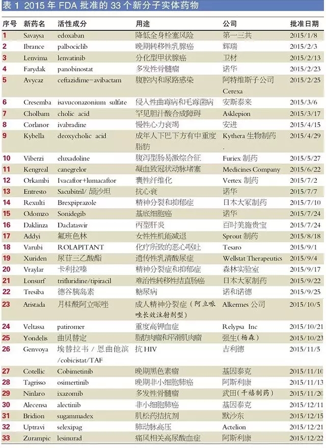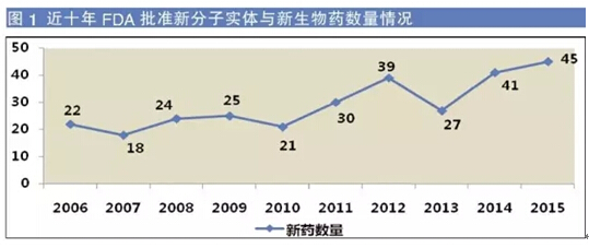2015年,FDA共批准了45个新药,包括33个新分子实体(NME)和12个生物制品许可申请(BLA),这一数字高于2014年的41个和2013年的27个,创下近十年来新药批准数量的新高。